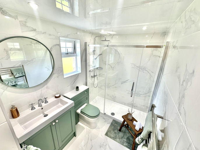 The traditional character is beautifully expressed through the Utopia Roseberry basin unit and wc unit in a soft Pistachio Green finish, complete with a matching round mirror. These are complemented by the Utopia Salino traditional style basin tap, adding a refined heritage touch. The result is a stylish and cohesive bathroom design that balances modern comfort with classic charm.
